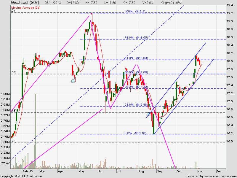 Great Eastern in a channel, 61.8 retracement from the highs is current resistance. Below 17.6 look for more downside